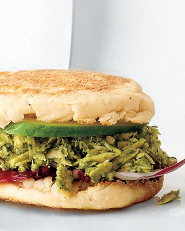 1 can (5 ounces) solid white tuna packed in water, drained and broken into chunks Basic Basil Pesto Radicchio or lettuce leaves 1 large English muffin Cucumber, sliced Fresh lemon juice