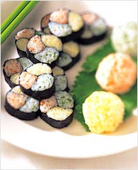 - 김발에 3등분한 김을 놓고 초밥을 골고루 얇게 편 다음, 시금치만 놓고 작은 김밥을 만다. 게살, 달걀말이도 각각 같은 식으로 말아 작은 김밥을 만든다.