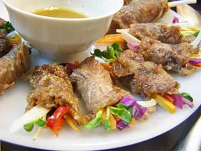 고기로 채썬 채소를 싸서 소스에 찍어 먹는다.