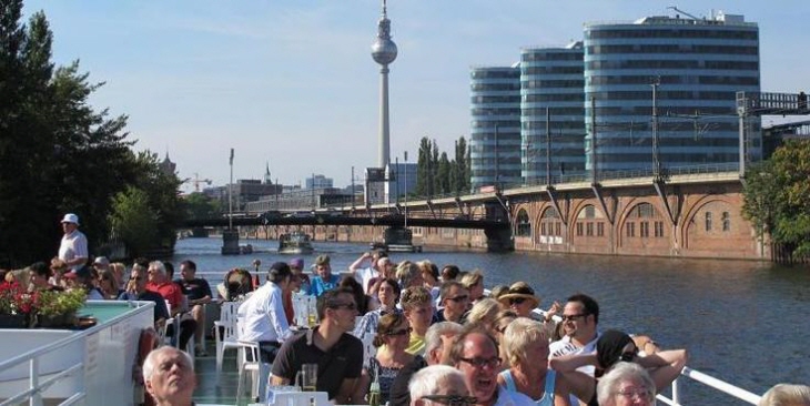 River Cruise "Trip on the Spree River" Sights:East Side Gallery, Mercedes-Benz Arena, Media Spree Area, Nikolaiviertel, Fernsehturm, Mühlendammschleuse, former Palace oft he Republic, Berlin Cathedral, Old National Gallery, New and Old Museum, Pergamon Museum, Bode Museum, Tränenpalast, Friedrichstraße Station, Bundespresseamt (Federal PR Office), ARD Capital Studio Berlin, Jakob Kaiser House, Reichstag (Parliament), Paul Löbe House, Marie Elisabeth Lüders House, Berlin Hauptbahnhof – Lehrter Bahnhof (Central Station), Moltke Bridge, Embassy of Switzerland, Bundeskanzleramt (Federal Chancellory), House of the Cultures of the World, Moabiter Werder, Bellevue Palace, German Ministry of the Interior, Meierei Bolle, Teleport, Spreebogen, Lessing House, Hansa Bridge