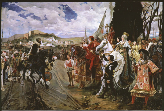 남미의 식민지 시대 미술을 잘 이해하기 위해서는 1492년에 스페인에서 무슨 일이 벌어지고 있었나를 이해하는 것이 중요하다. 1492년 1월에 스페인에서는 그라나다에 남아있던 이슬람 Moor 족을 완전히 몰아내는 중요한 사건이 일어난다. 스페인은 711년에 아랍세력의 침입을 받고 오랫동안 많은 영토가 모슬림에게 점령되어 있었다. 위의 지도에서 1000년 경 스페인의 땅 Al-Andalus 지역이 모슬림 치하에 있었다. 스페인 역사는 이슬람교도를 몰아내기 위한 투쟁의 역사라고도 할 수 있는데 안달루시아 지방에서 떠나지 않고 살고 있었던 Moor 인들을 1492년에 북아프리카로 완전히 몰아낸다.