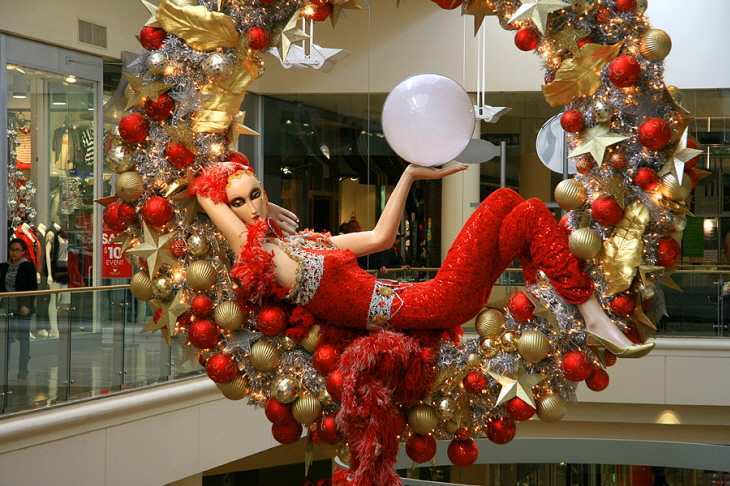 장식구슬위에 올라앉은 마네킹은 크리스마스 파티복장으로 갈아입고 있었다.