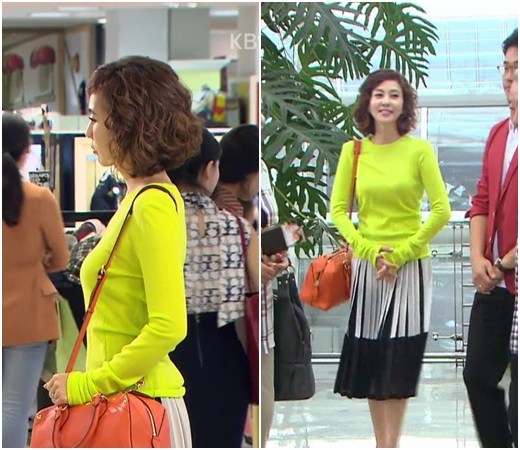 이 장면에서 김남주는 그녀의 심경과는 반대로 네온 컬러의 니트에 비비드한 오렌지 컬러의 보스턴백으로 톡톡 튀는 스타일링을 선보여 눈길을 끌었다.