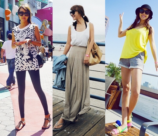 내추럴하게 연출하기 위해서는 면소재에 베이지톤이나 카키 정도의 색을 고르고 여기에 편안한 플립플랍을 매치하자. 또한 시크하게 연출도 가능하다. 간단하게 화이트와 블랙 아이템을 믹스매치하면 된다.