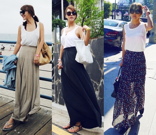 민소매 티셔츠와 함께 올 여름 빼놓을 수 없는 아이템은 맥시스커트. 밑단이 넓어 통풍이 수월해 시원하고 유행이다보니 종류도 많아 자신의 취향에 따라 마음껏 연출이 가능하다.