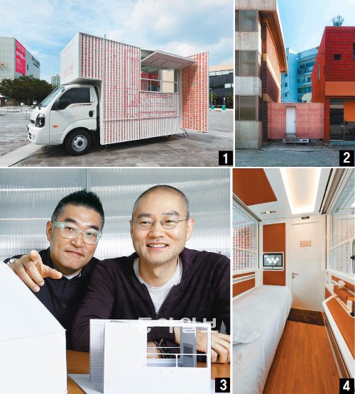 도심에 건축물 하나 지어 달라는 부탁을 받으면 누구나 기념비적인 무언가를 떠올릴 것이다. 더구나 실용적인 기능이 없는 장식용이라면 말이다. 하지만 광주 비엔날레의 폴리(folly·실험적 공공건축물) 프로젝트 작품을 의뢰받은 형제는 1.2t짜리 봉고 트럭을 개조한 1인용 호텔을 내놓았다. 눈에 확 띄는 영구적 기념비와는 거리가 멀다. 이곳저곳 옮겨 다니는 데다 어느 골목에 자리 잡아도 튀지 않도록 위장용 가림막까지 쓴다. 세계적인 설치미술가 서도호 씨(50)와 건축가 서을호 서아키텍스 대표(48)의 ‘틈새호텔’이다.