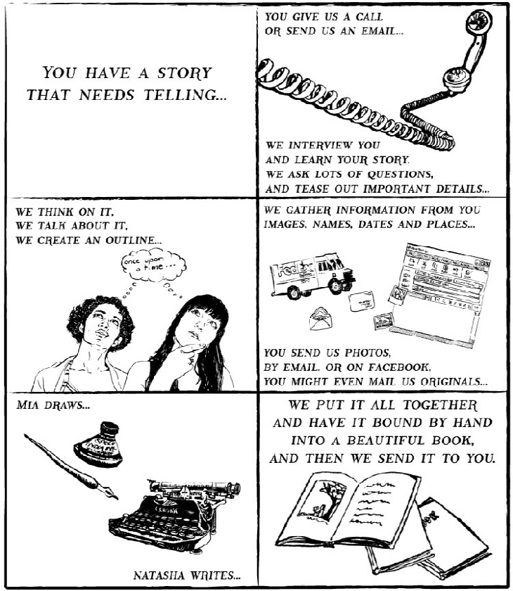 그렇다면 이 서비스는 어떻게 이용할까. Velveteen 서비스의 공동 창업자인 Mia와 Natasha 에게 전화를 하거나 이메일을 보내는 것이 그 시작이다. 삶의 중요한 부분들에 대하여 전화로 자세히 인터뷰하거나 이메일로 설명하는 것이다. 사진은 이메일이나 페이스북으로 제출하면 Mia가 책에 잘 삽입해준다. 반면 Natasha 는 글쓰기를 담당한다. 책의 내용이 완성되고 나면 시애틀의 Kohler Bookbinding이 손으로 정성껏 책을 엮어주고, 이렇게 만들어진 책은 고객에게 배송된다.