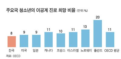 한편 OECD 통계는 한국 청소년이 수학과 과학 분야에서 최상위권의 학력을 갖추고 있으면서도 주요국 또래 가운데 이공계 분야에 대한 선호도가 가장 낮다는 점도 보여줬다. 한국 청소년은 수학ㆍ과학 부문 국제 평가(2009년 기준)에서 각각 1위와 3위를 차지했으나, 장래 이공계 분야 직업을 선택하겠다는 비율은 8%에 불과해, 32개 회원국(OECD 평균 11%) 가운데 28위에 머물렀다. 입시문제 전문가들은 "대입 경쟁이 워낙 치열하다 보니 상위권 대학을 가기 위해서는 이과뿐 아니라 문과에서도 수학을 잘해야 하고, 그런 이유에서 수학이 우수한 학생이 오히려 문과를 지망하는 '역선택'이 많다"고 말했다.