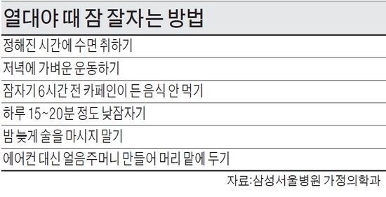 하지만 에어컨을 잠든 뒤에도 계속 켜놓으면 신체 밸런스에 좋지 않다. 홍승철 성빈센트병원 수면클리닉 교수는 "에어컨은 호흡기를 건조하게 만들어 오히려 숙면을 방해할 수 있다"며 "에어컨 대신 얼음주머니를 머리 옆에 놓고 자면 잠들기 전 체온을 적절하게 낮춰주고 잠이 들고 나서도 얼음이 녹아 에어컨처럼 체온을 과도하게 떨어뜨리지 않는다"고 말했다. 선풍기는 바람을 직접 쐬면 두통·질식이 일어날 수 있으므로 벽쪽으로 향하는 것이 좋다. 특히 만성 폐질환자, 어린이, 노약자는 바람을 직접 쐬지 않도록 주의한다.