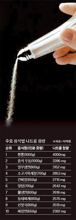 간과하기 쉬운 식품도 있다. 물냉면·메밀국수·자장면 등에도 나트륨이 많다. 물냉면은 김치국물에 육수를 부어 만든 음식이다. 김종욱 연구관은 "음식점에 싱겁게 해 달라고 요청하고, 국물은 되도록 먹지 않는 게 좋다"고 말했다. 감자칩 한 봉지에는 2300㎎의 나트륨이 들어 있다. 피자·식빵·소시지·햄·치즈도 2~3조각 먹으면 일일 나트륨 섭취량을 초과한다.