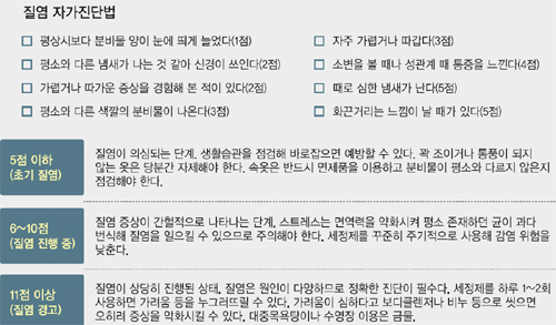 질염은 생활습관 개선 등 자가관리가 가능한 질환이다. 예방하려면 스키니진이나 레깅스·스타킹 등 꽉 조이고 통풍이 되지 않는 옷을 피하고, 속옷은 통기성이 좋은 면 제품을 입는다. 야근이나 과로를 줄여 스트레스를 받지 않도록 한다. 생리주기를 체크하듯 평소 질 분비물의 변화를 주기적으로 확인하는 것도 추천할 만한 방법이다.