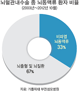 2003∼2012년 뇌출혈 및 뇌질환으로 부천성모병원 뇌졸중센터에서 뇌혈관내수술을 받은 환자 2468명 중 비파열 뇌동맥류 환자는 805명으로 33.0%를 차지했다. 뇌동맥류 환자의 남녀 평균연령은 여성이 59.5세, 남성이 55세로 55∼59세 연령대에 위험도가 높은 것으로 나타났다. 805명 중 여성 환자가 67%인 539명, 남성환자는 33%인 266명으로 여성 환자의 비율이 훨씬 높았다. 20∼30대도 39명으로 4.8%를 차지해 일부 젊은 층에서도 뇌혈관 기형이 나타남을 보여준다. 환자 수는 2003년 16명에서 2011년 163명으로 크게 증가했다.
