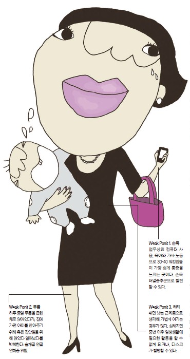 최씨가 말하는 '온몸'은, 사실 관절을 말하는 것이다. 처음 "팔, 다리, 허리가 아프다"고 말하던 그에게 자세한 부위를 묻자 손목, 무릎, 허리로 좁혀졌다. 30?40대 워킹맘은 미혼 여성이나 남성들과 같은 강도의 업무를 하면서, 퇴근 후에는 가사와 육아까지 병행하게 돼 관절을 무리하게 사용하는 경우가 많다. 특히 손목?무릎?허리는 가장 많이 사용하는 관절 부위로서 이 부위 통증은 워킹맘을 힘들게 하는 3대 관절 통증으로 꼽힌다.