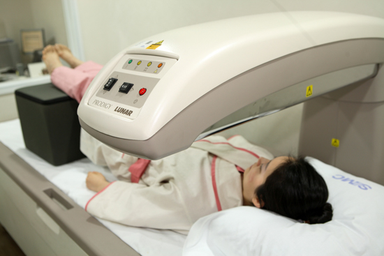 ↑ 한 여성이 뼈 상태를 살피기 위해 약한 X선을 이용하는 골밀도 검사기에 누워 검사를 받고 있다. ●강북삼성병원제공