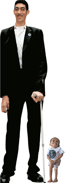 2m46㎝의 세계 최장신 남성 술탄 코센(28·터키·왼쪽)과 최단신 남성인 59.93㎝의 준리 발라윙(18·필리핀·오른쪽). 전 세계 70억 인구 중에는 성인이 돼도 키가 1m가 채 안 되는 사람이 있다. 반대로 2m가 훨씬 넘는 사람도 있다. 필리핀 민다나오섬의 준리 발라윙(18)은 59.93㎝에 불과하다. 발라윙은 두 살 때 성장을 멈췄다. 반면 세계 최장신 남성은 2m46㎝의 키를 가진 터키 청년 술탄 코센(28)이다. 그는 거인증, 즉 뇌하수체에 생긴 종양 때문에 성장호르몬이 과다 분비돼 키가 멈추지 않고 계속 자라는 병을 앓고 있다.