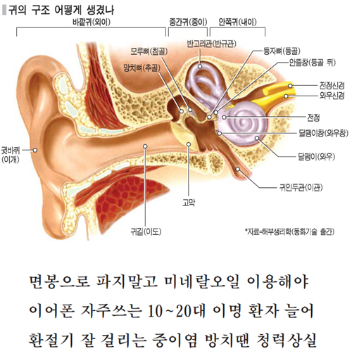 ◆ 귀지는 미네랄 오일로 녹여 빼내야 귀 질환은 귀를 후벼서 생긴 상처가 악화돼 발병하는 경우가 많다. 또 귀 주위의 혈액순환이 잘 안돼도 질환이 생기기 때문에 담배를 끊고 과음을 하지 말아야 한다.