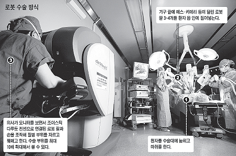 3~4년 전 국내에 로봇 수술이 도입될 당시 로봇 수술은 주로 직장암과 전립선암에 쓰였다. 배에 구멍을 뚫어 내시경을 집어넣는 방식의 기존 복강경 수술은 수술 기구가 휘는 각도가 적어 암이 골반 뒤쪽, 직장 아래쪽에 있을 경우 접근에 애를 먹는다. 하지만 로봇 팔과 손은 최대 270도까지 꺾이기 때문에 깊숙한 부위까지 다양한 각도로 접근할 수 있어 식도암·갑상선암·신장암 수술 등에도 확대되고 있다. 현재 전국에 30여대의 로봇 수술 장비가 도입돼 있다.