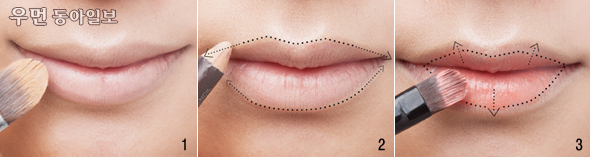 1. 립 컨실러를 이용해 입술 톤을 다운, 립스틱 컬러의 선명도를 높여준다. 우선 브러시로 얇게 펴 바른 다음 두드리듯이 발라준다.