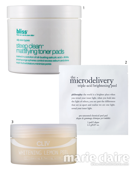 1 블리스 스팁 클린 매티파잉 토너 패드. 50패드, 6만5천원. 과일 추출물이 피부결을 깨끗하게 정돈하는 패드형 토너.