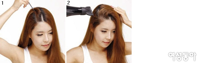 1 가운데 가르마를 기준으로 한 움큼 모발을 잡는다.