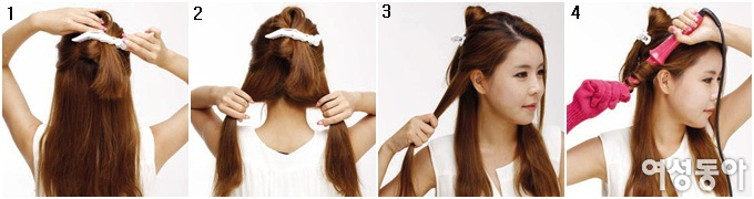 2 모발을 양갈래로 나눠 귀 위쪽 부분에서 묶는다.